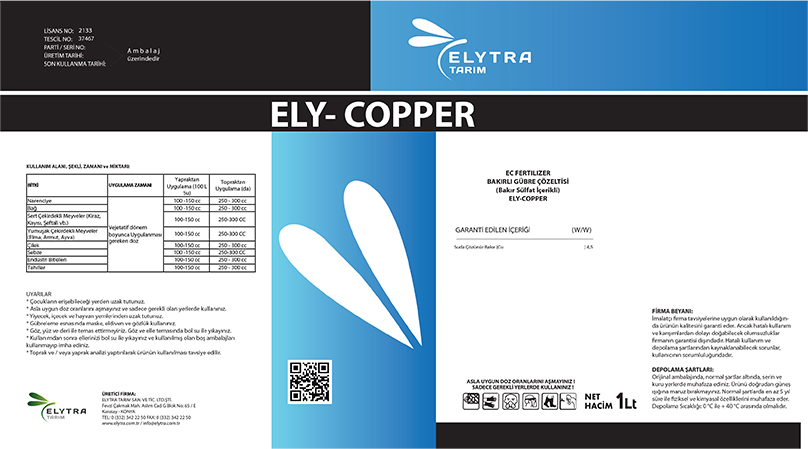 •Ely-Copper her tip toprakta ve iklim koşullarında uygulanabilen, bitkinin kökleri ve yaprakları tarafından kolayca ve tamamen alınan özel yapıya sahip sıvı "sistemik" bir bakır gübresidir.